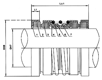 1、靜環(huán)墊 2、靜環(huán) 3、動環(huán) 4、波紋管 5、傳動套 6、緊圈 7、彈簧